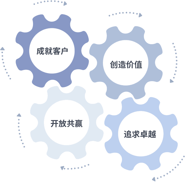 成就客户是一切决策的出发点,,,,创造价值是衡量所有工作的标准,,,,追求卓越是我们做事做人的态度,,,开放共赢是我们的格局也是最终的结果。。。价值观的齿轮环环相扣,,,,推动着组织里的每个人不断向前。。