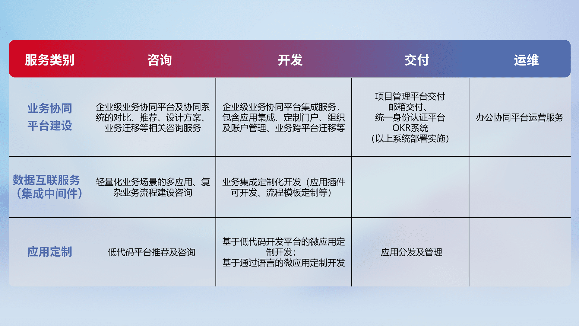 针对钉钉、、、企微、、、、IDaas等平台级产品提供产品的规划、、、方案、、、、交付、、定制化开发等服务,,,,实现如统一协同办公、、、、智能客户服务、、、混合会议管理、、智能数据查询、、等业务场景,,实现数字化转型。。。。