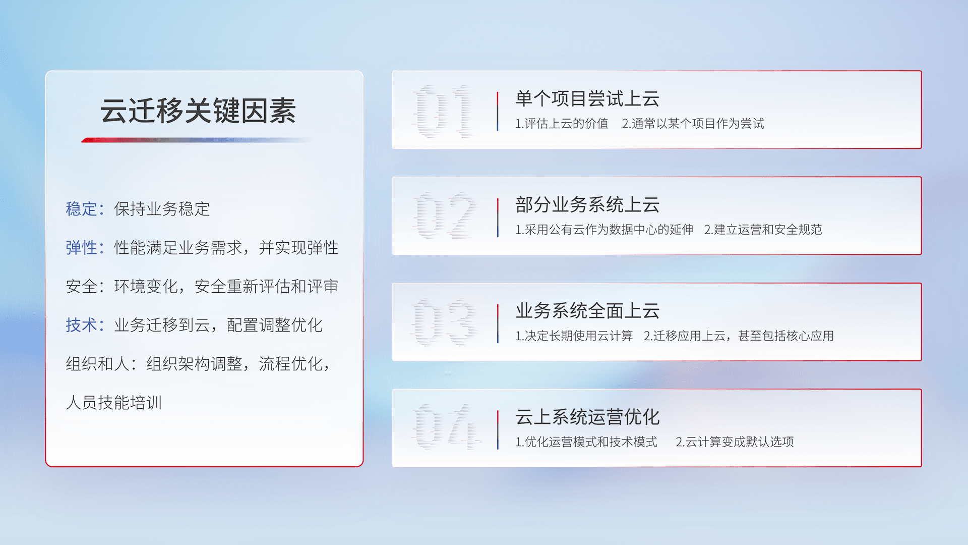 结合实际业务,,,从规划设计、、、、云平台选型、、、云原生改造、、、、数据迁移、、、、集成交付,,,迁移全过程为客户识别最佳上云路径,,,,做好风险识别管理,,,设计网络架构、、、、身份权限、、安全审计合规、、、、操作审计、、、日志审计、、监控告警策略、、、、多站点容灾设计等,,对云上基础设施进行整体规划,,提升IT治理水平,,,以满足弹性、、、、高可用、、高性能的需求。。。。