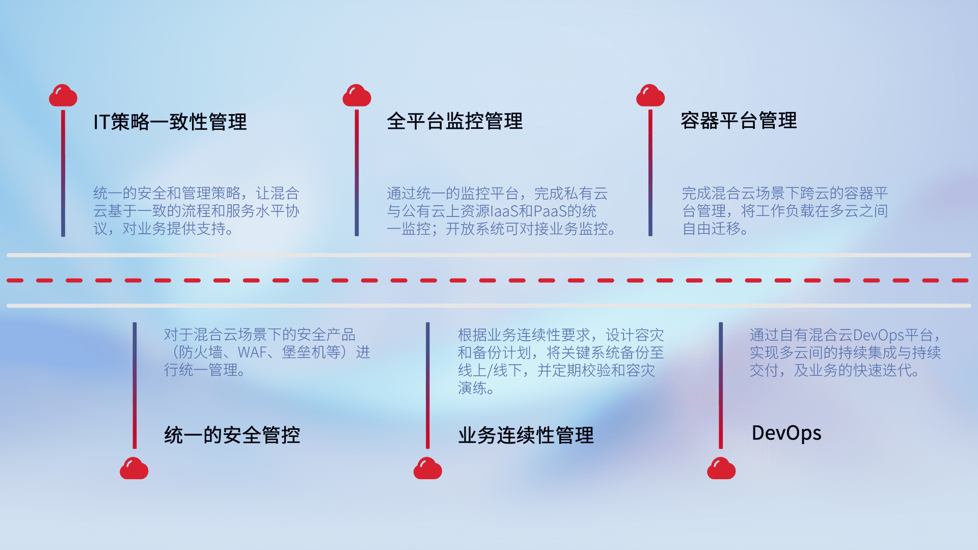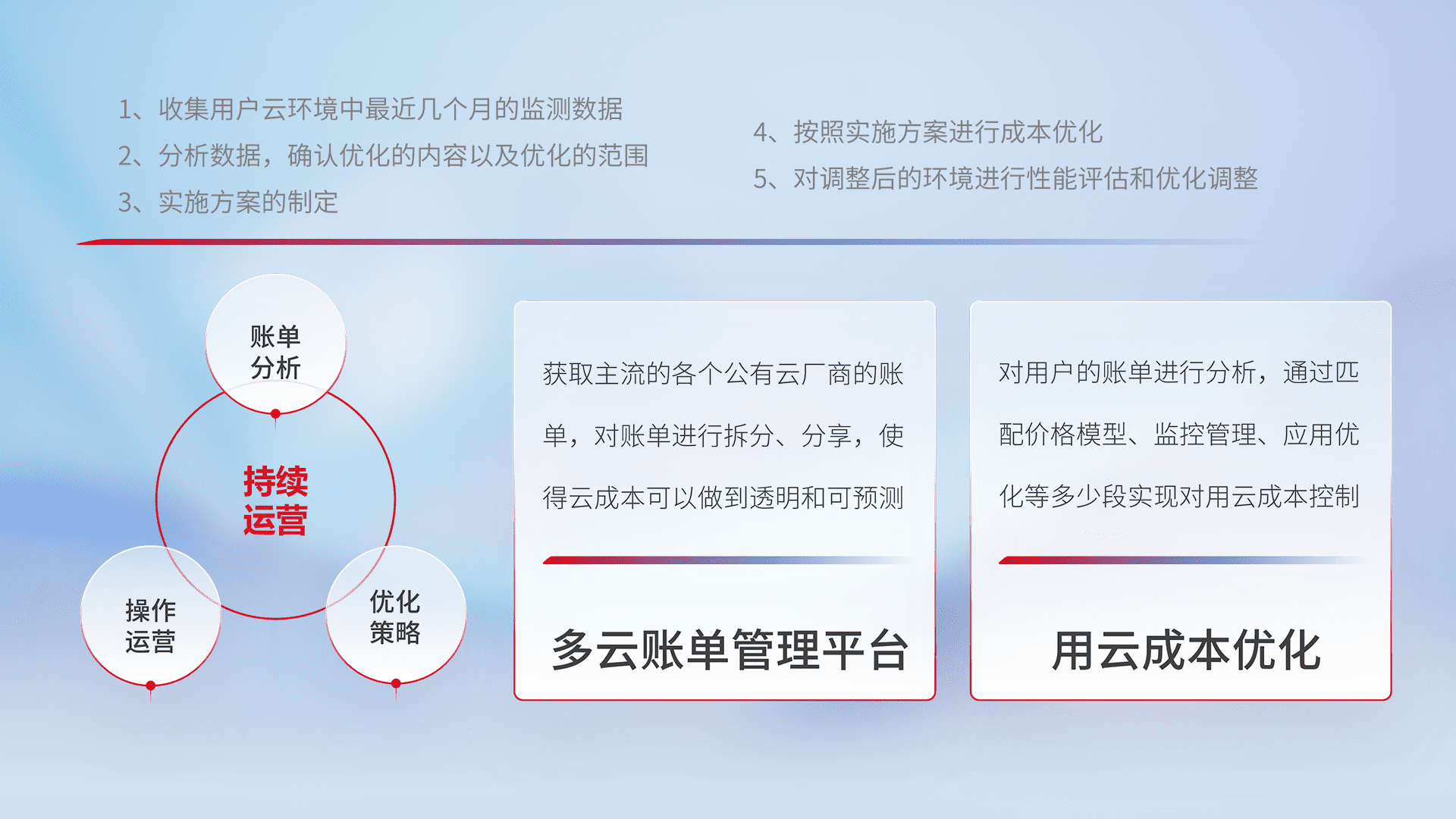 通过多云纳管,,,,以统一的资源数据模型把客户的云资源进行抽象和封装,,,,进而实现对多云资源的统一操作,,保障云资源管理的可靠性、、稳定性与可用性。。。量身定制化运维内容,,,配置、、、、开发运维、、、、补丁管理、、、备份、、监控、、认证和访问管理、、审计和日常巡检等,,保障在用云过程中的可靠度,,稳定度以及高可用率。。。
